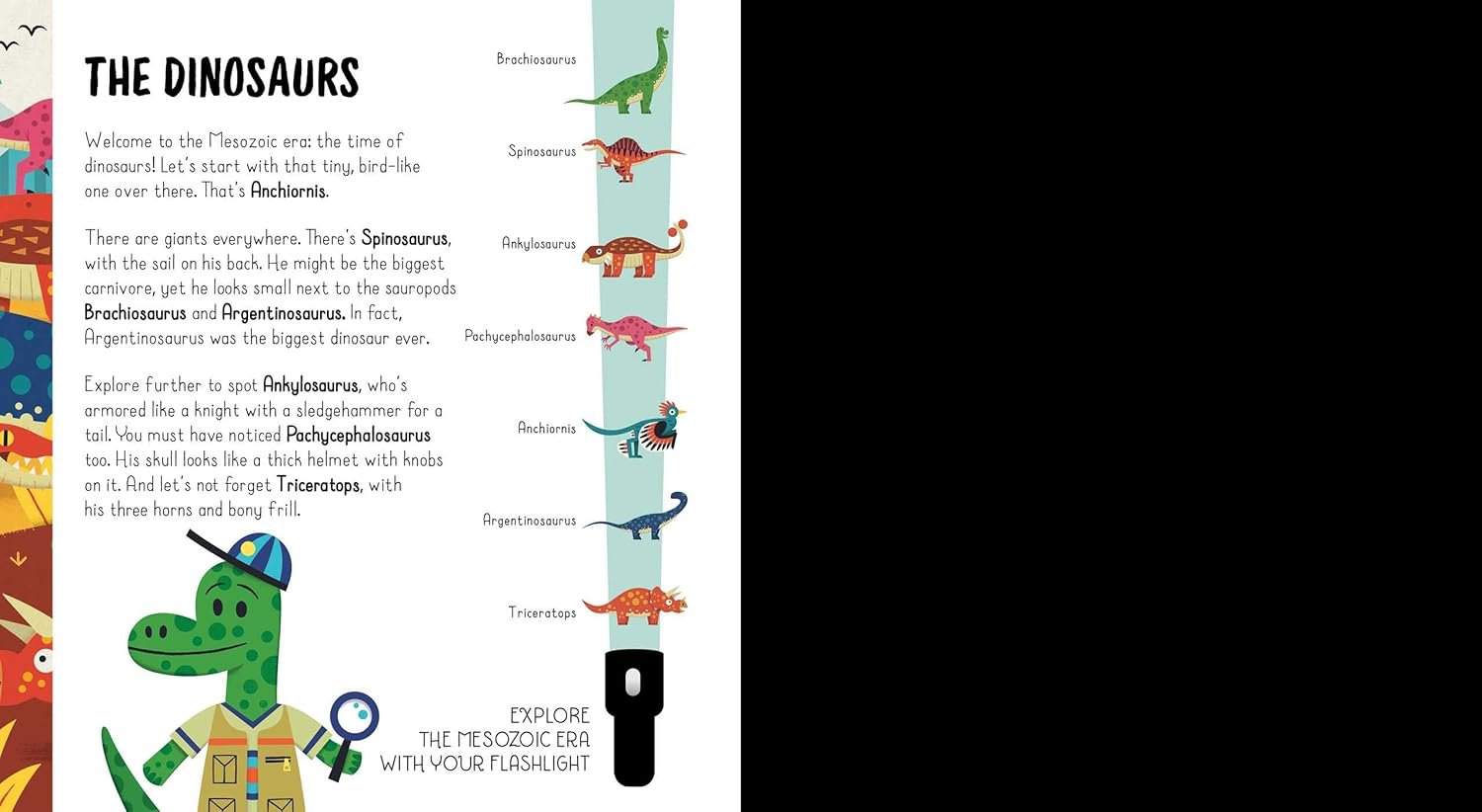 Young explorers will enjoy this spotlight discovery! In every book, a personal guide will help children in their search through all different kinds of dinosaurs. A cardboard cut-out flashlight is included to shine behind the dark acetate and reveal illustrations!