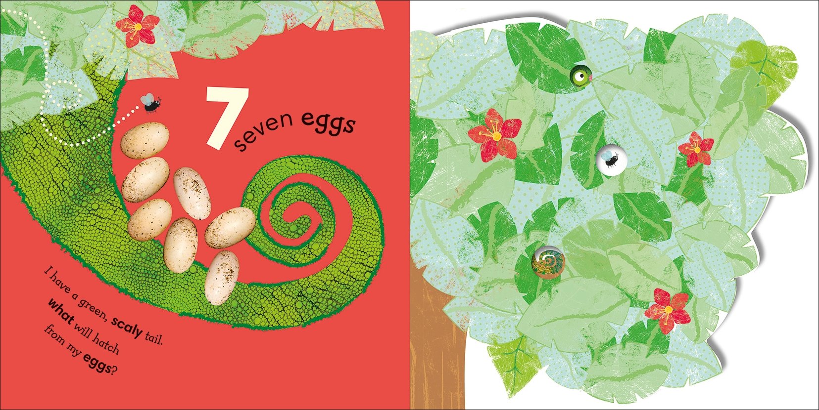 There are eggs to count from 1-10, then flip the flap to find out whose eggs they are. A clue encourages children to guess who the babies will be: “I have a green scaly tail. Who will hatch from my eggs?” says the mommy chameleon. Intriguing cut-through holes in the flap reveal further clues, with eyes or tails peeping through.