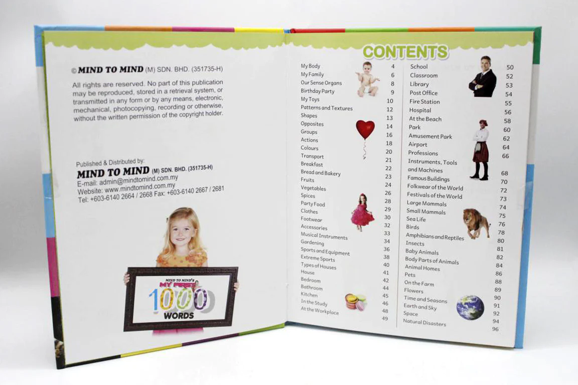 - The book acts as a fantastic ‘starter pack’for the learning child to learn and familiarize himself or herself with commonly used words in their everyday life. Stressless and lovable, this 1000 worded book is a must for every household with young learners. A perfect study tool to enhance the learning child’s vocabulary.