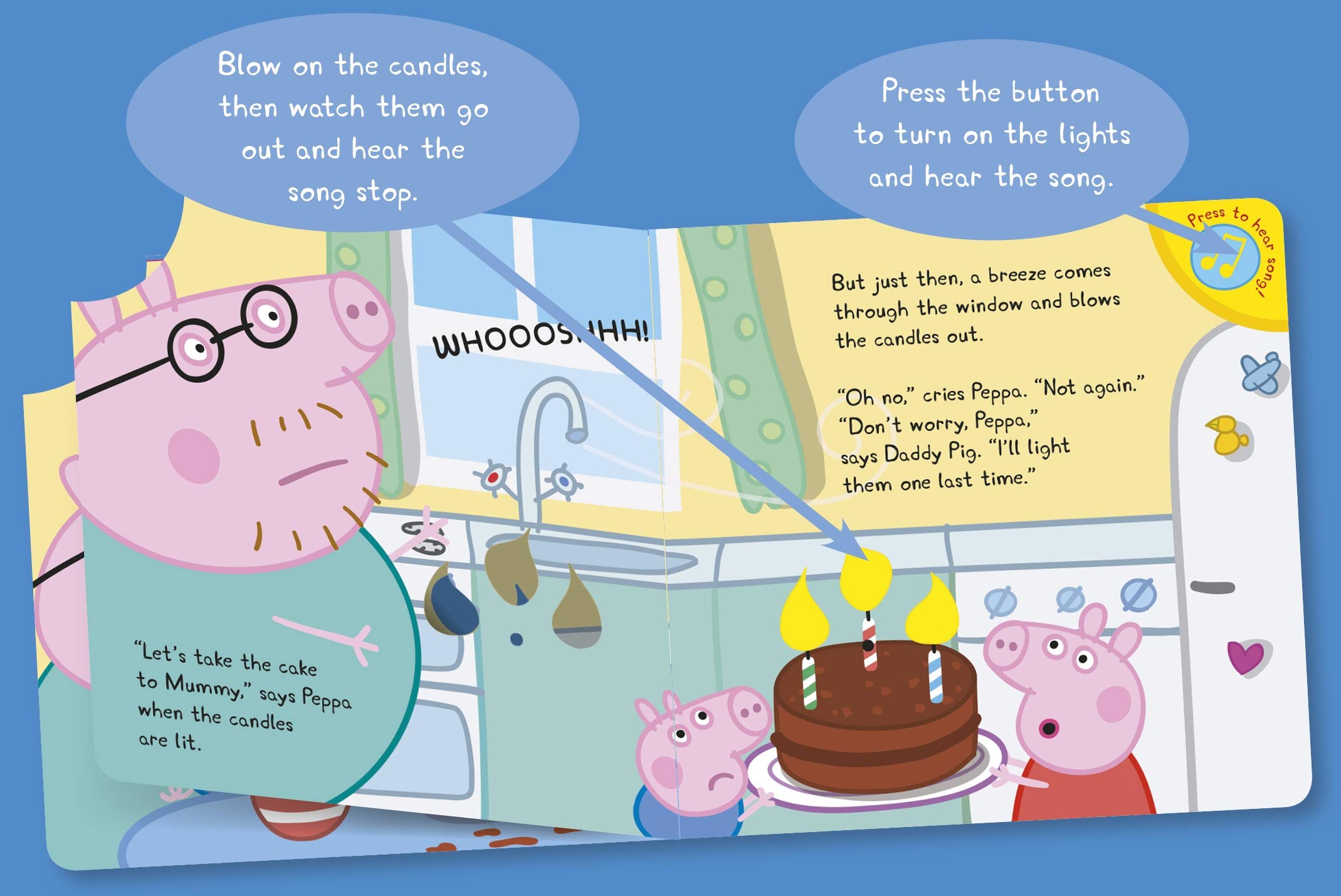 Celebrate Mummy Pig’s birthday with this special novelty board book with sound and light-up candles that you can blow out!