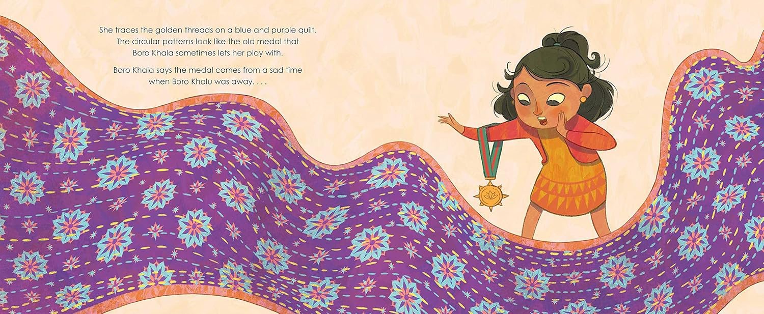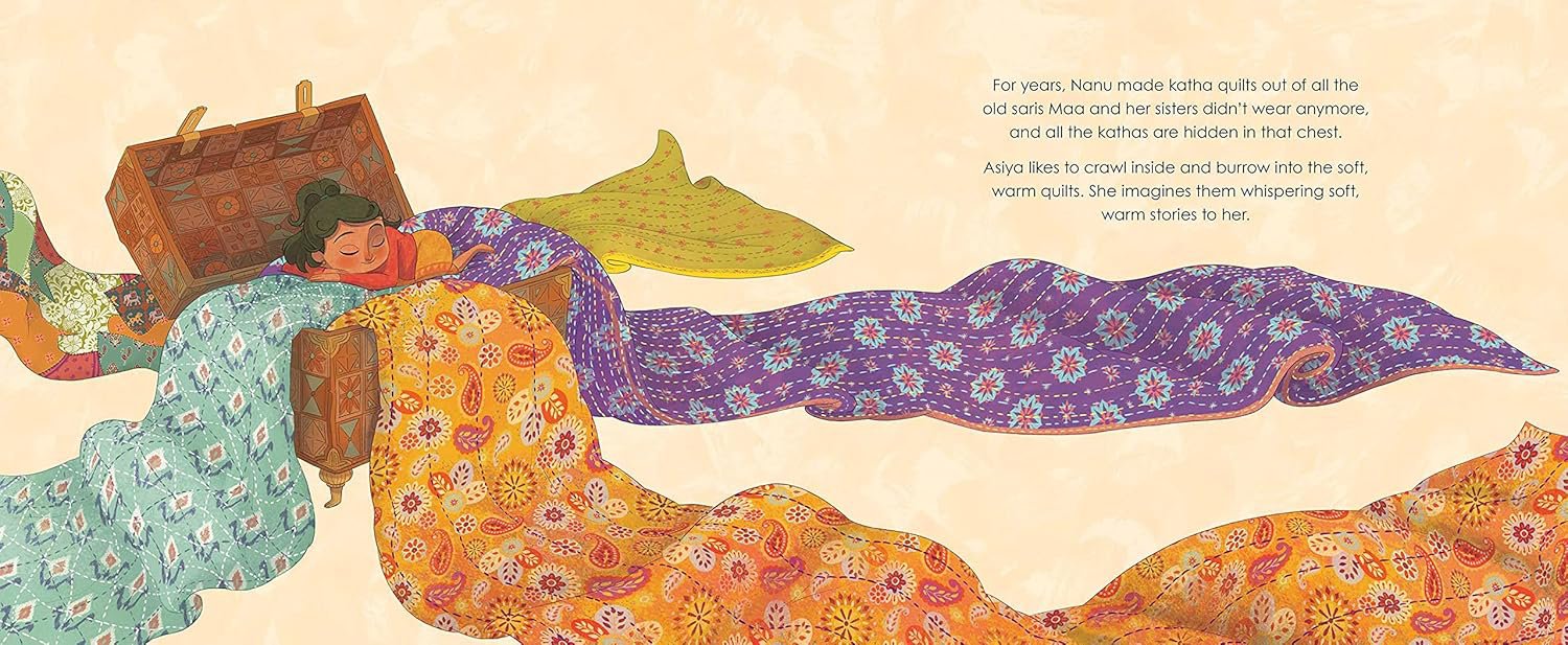 Asiya loves to visit Nanu’s house where she can rummage through Nanu’s katha chest filled with quilts. There are stories in each of the quilts that her Nanu has collected through the years, all about the bold and brave women in Asiya’s family. Among all of the games and exciting things at Nanu’s house, Asiya thinks these hidden histories are the grandest treasure.