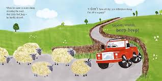 Little Red Jeep is in such a big hurry to get to Cow’s party that he bursts right through a herd of sheep, forgetting to say ‘please’, ‘thank you’, ‘sorry’ or ‘excuse me’.